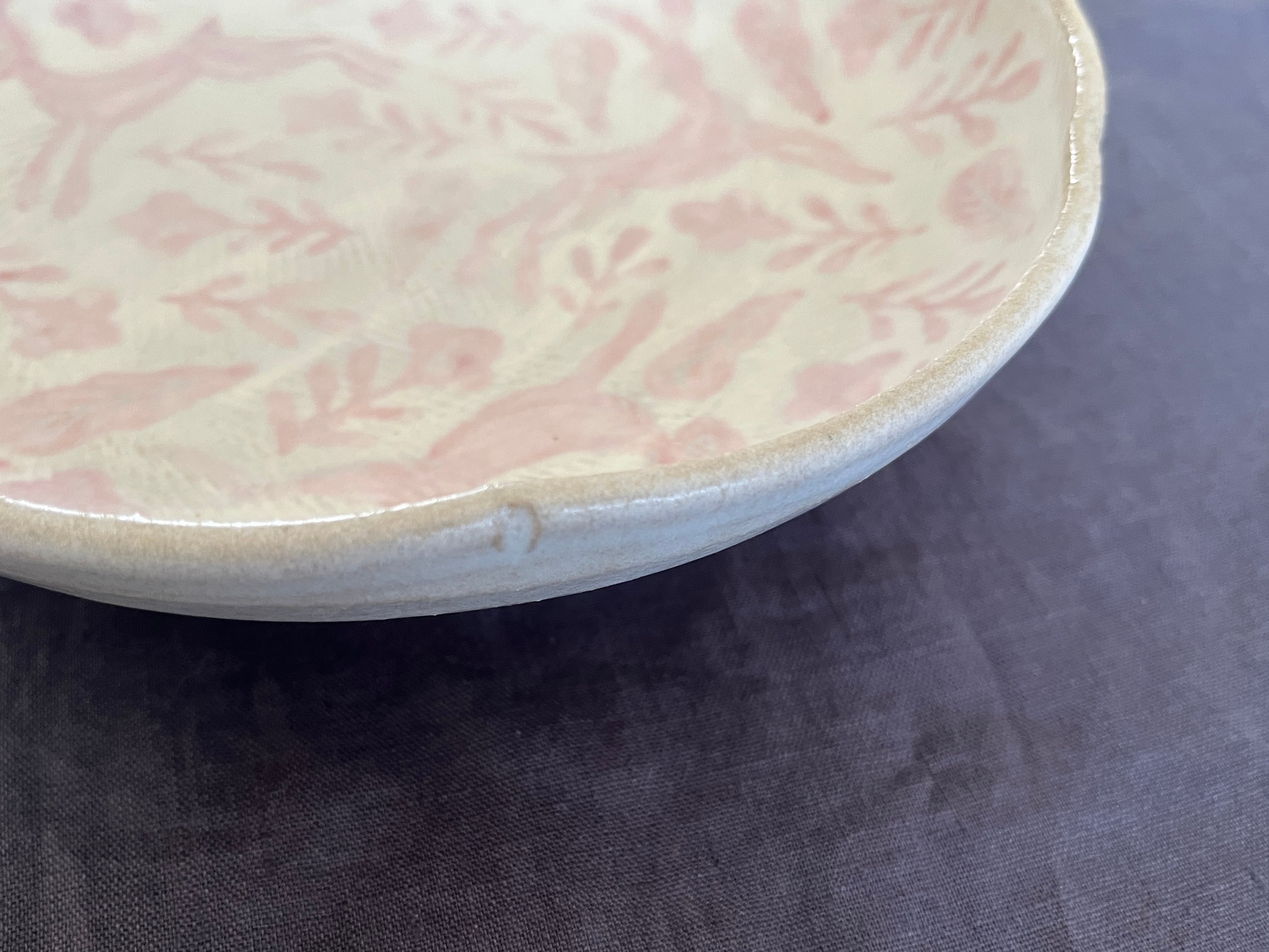 赤土をロクロで挽き、白化粧土を施した上に、ピンク化粧土で模様を描いています。